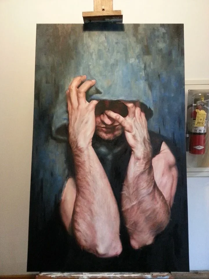 Then I started on first pass color of the arms. They were large and challenging and it took a while to get enough paint on the canvas to cover it. I don't remember how long each arm took but I know they were a majority of the time taken. Once First pass color was completed on most of the skin I started rendering in more in the face and hands. I worked top to bottom of the canvas as I was a bit intimidated by Dom's hairy arms. I sucked it up and turned off my brain and just went for it trusting in my instincts. Sure enough it was as easy as that and with a few washes and blurring I created the illusion of hair. Everything is just shape and color right?