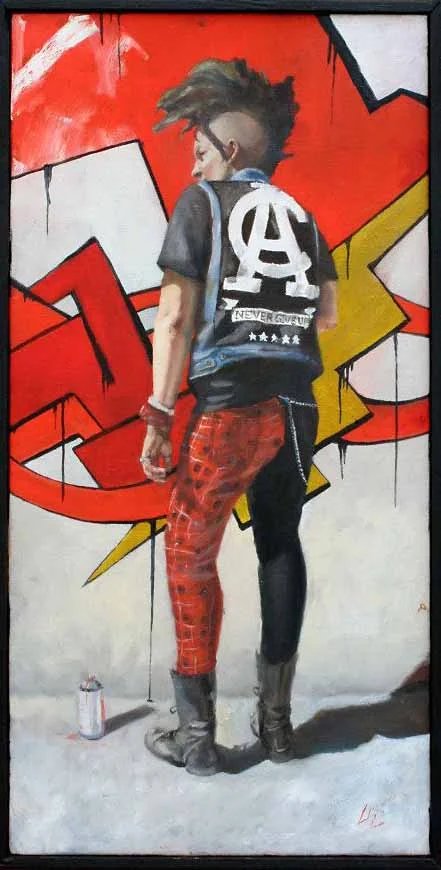 "Burden" is a large powerful piece that expresses the weight of life's struggles and the rogue's desire to fight past it . His hooded cloak is draped around him and is painted blue to show a sense of sorrow. His arms are tense and his hands are grabbing around his face and hood, ready to scrape away the pain. A watchful eye peers out of the shadows with determination and his lips are beginning to smirk mischievously, tasting the sense of freedom. Black surrounds the figure at the bottom evoking drama. The style "Burden" is painted is a mix of realism and abstracted strokes to capture the surreal feelings and ideas that haunt him.